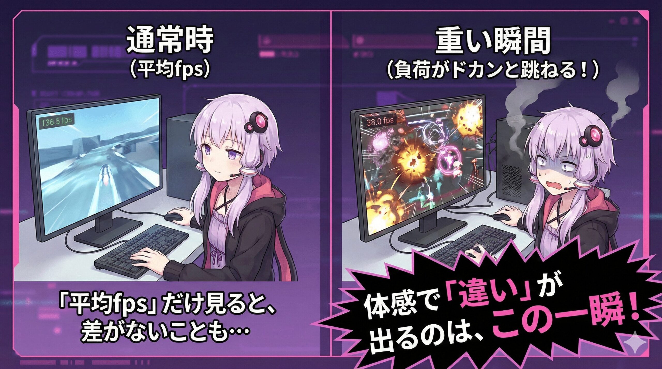 「平均fps」という数字だけ見ると、そこまで大きな差がないこともあります。 でも、体感として違いが出るのは、「一瞬だけ負荷がドカンと跳ねる瞬間」です。