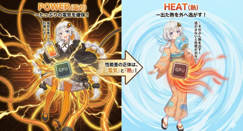 GPUの仕組みは、「電気を使って計算して、そのぶん熱を出す」というものです。 性能を出すためには、たっぷりの電気を確保して、出た熱をどんどん外に逃がしてあげる必要があります。