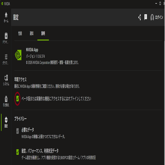 まずNVIDIAアプリでベータ参加を有効化しましょう!