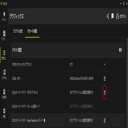 次にNVIDIAアプリのグラフィックスタブで、ゲーム個別かグローバル設定を開き、DLSS オーバーライドのモデルプリセットで最新を選んで適用しましょう。